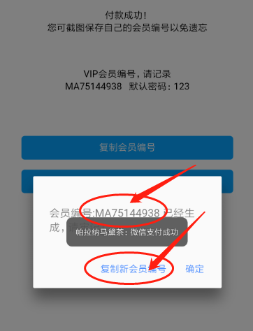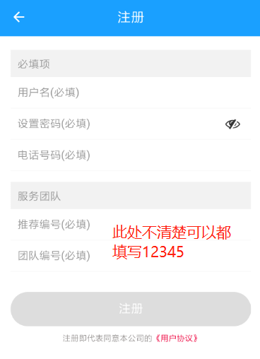 注册新会员(无推荐人情况) 1.下载app 2.打开APP,点击“新用户注册” 3.填写您的①姓名、②密码、③电话 ,以及推荐人信息(必填),有朋友有编号的请填写他的编号。如果不清楚推荐人的可以填写12345 4.注册选择产品套餐,付款,可以选择微信或支付宝,付款后即产生会员编号 5.付款后即产生会员编号,请牢记编号及您的密码,编号产生后可以复制粘贴,请妥善保管。密码不可复制,请牢记。 6.复制好自己的编号后,可以直接到达您自己的管理后台操作了。