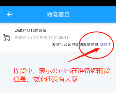 5.查看物流信息。如果提示物品“拣货中”状态,表示公司已在准备您的货物,但是物流尚未取货。请耐心等候