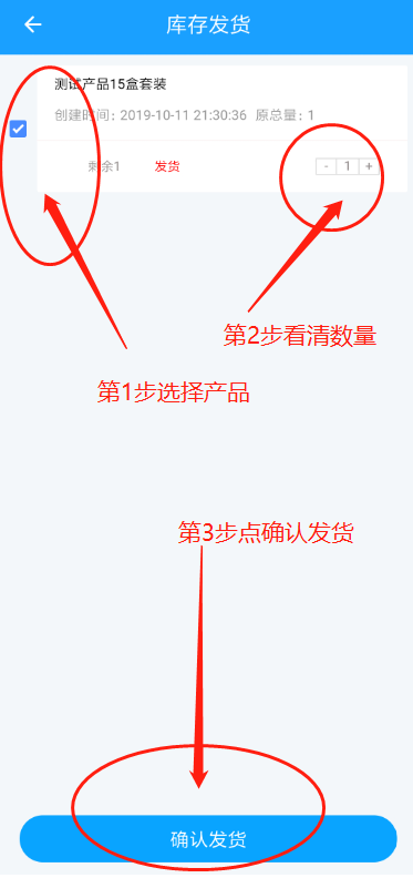 2.进入“库存发货”等候物品检索后,选择产品、选择数量、点击“确认发货”
