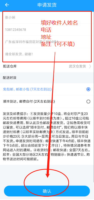 3.填写收件人信息:姓名、电话、地址、备注(备注可以不写)选择物流,之后点击“确认”。发货完毕。可以返回会员中心。